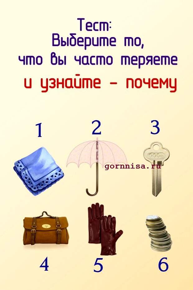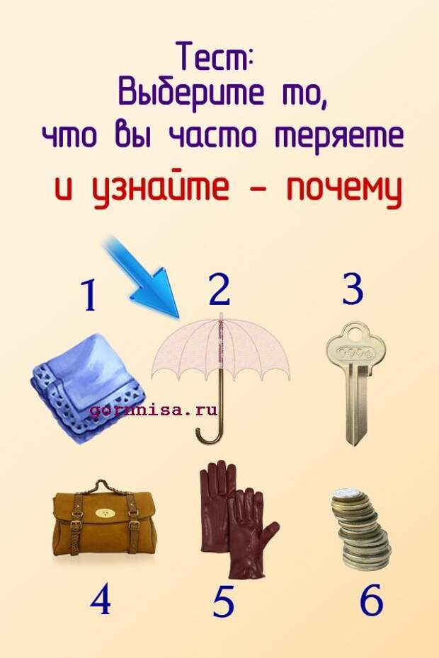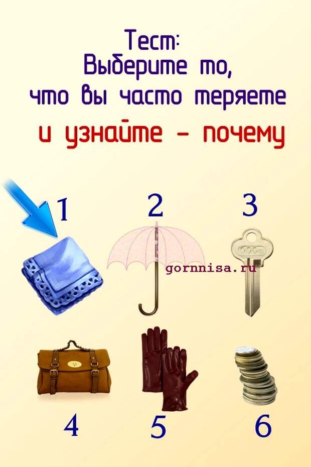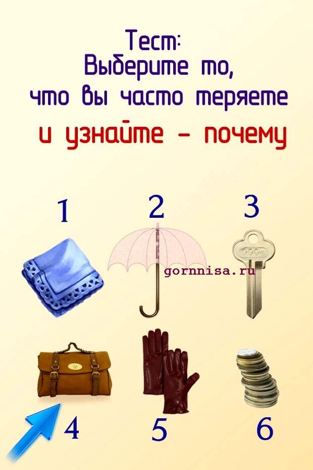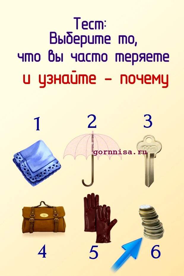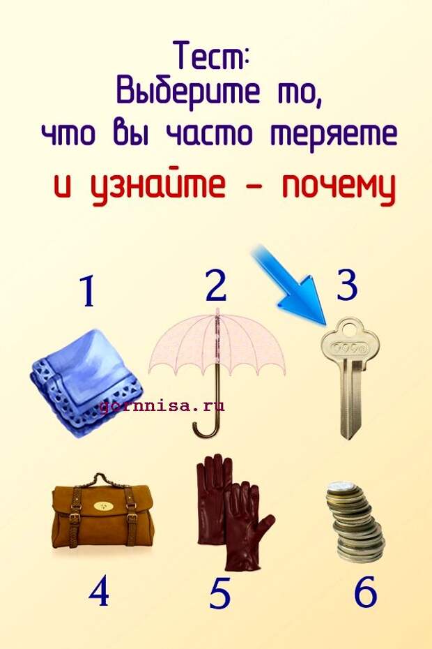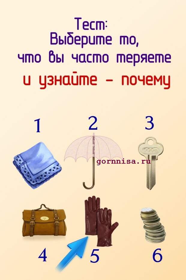 Люди часто теряют вещи, предметы, аксессуары. Иногда это не рассеянность и не случайность, а подсознательное желание избавится от того, что им не нужно, от того. что мешает им.Предлагаем Вам разобраться от чего Вы пытаетесь освободиться теряя свою личную собственность Выберите предмет из …